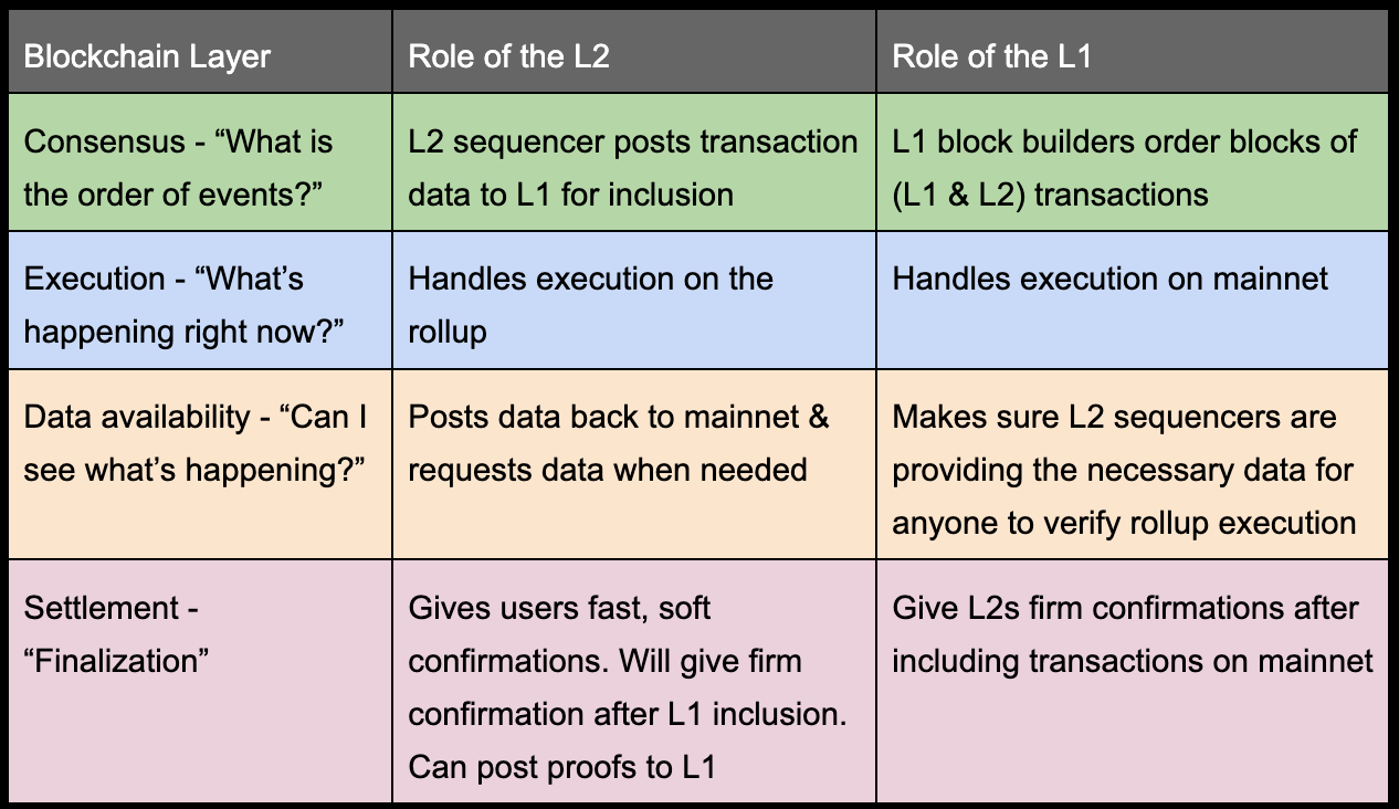 En primer lugar, abordemos brevemente las funciones de una cadena de bloques dentro de una relación Ethereum-Rollup.